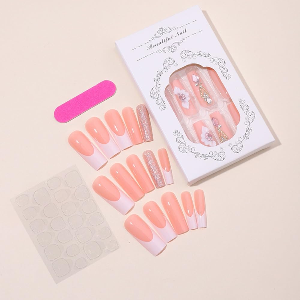 💖 Long Coffin Press-On Nails – Add instant glamour with these pink French tip nails featuring sparkling rhinestones, floral accents, and glitter details. 🌸✨ Made from durable, safe acrylic, they’re easy to apply and reusable with glue or jelly stickers. Perfect for parties, weddings, proms, or everyday elegance, these full-cover artificial nails give you a salon-quality manicure in minutes. A must-have for nail art lovers or as a thoughtful gift! 🎀💅